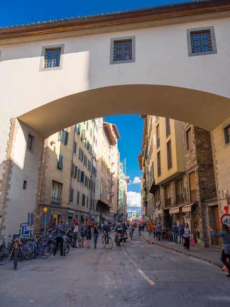 A passage way connects the Uffizi with the Pitti Palace and Gardens, crossing over the Ponte Vecchio (which means old bridge). In the picture below, you can see it crossing over the street. It’s open for tours now. I find these secret passages fascinating. You can live in a building and have a historic walkway right above or below you. The Medici used this to travel back and forth in privacy.