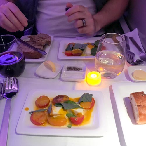 To conclude Saturday, RBD and I had dinner together, like, actually facing each other, on an airplane. She had the chicken, I the beef short ribs. There were several courses. The Flight Manager brought us a LED candle, which flickered in the purple cabin light. Weirdest date ever, and certainly the highest. We reminisced about our crappy, roach-infested apartment on the East Side, how utterly poor we were, and how far we’ve come … geographically-speaking, of course, since by this point we’d left the continental United States.