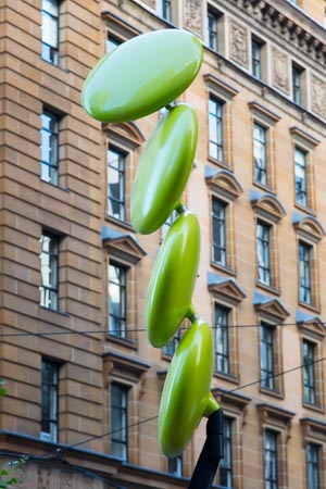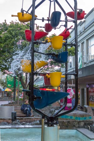 On Cuba Street, the hip place, this thing dumped water everywhere … mostly outside the foundation base. I feel this defeats the purpose of a fountain art. Water is pumped up, fills the buckets eventually tipping them, and so on down the line.