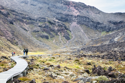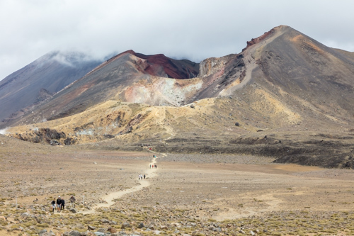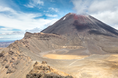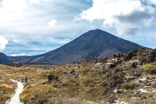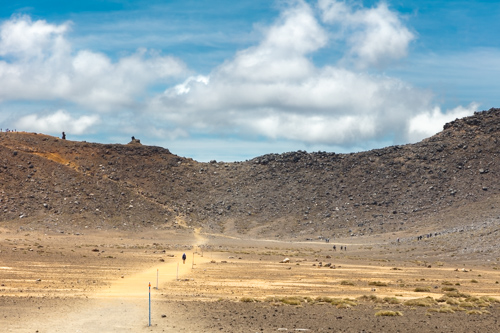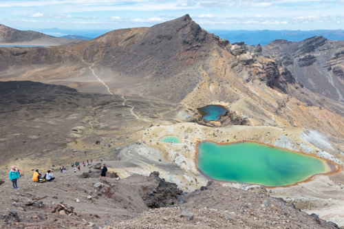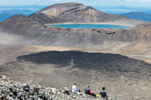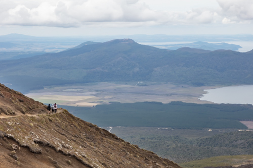 Our decent begins. The trail ends near the tiny, white sliver just below the dark, forested area. We have a long way to go. The far lake beyond the ridge is Lake Taupo, where people just casually go about their recreational activities cool with the fact it’s a caldera. It has a surface area of 600 square kilometers, or about the size of Singapore, and is one of the largest fresh water lakes.