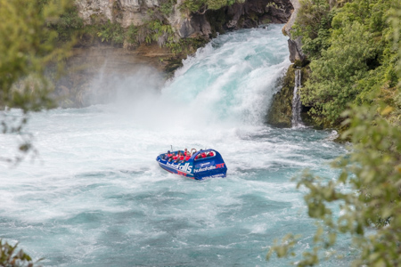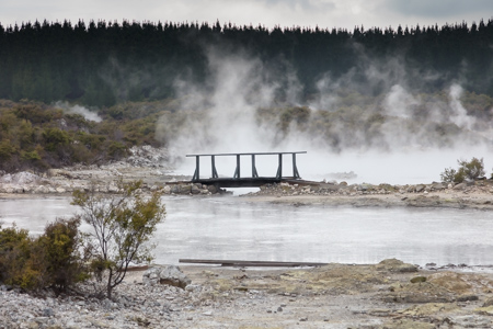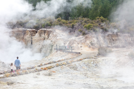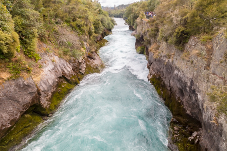 Huka Falls is close to Taupo, so we stopped. Water drains from Lake Taupo and feeds several hydroelectric plants downriver. This system of plants accounts for 15% on New Zealand’s power. The water flowed through a channel in the rock, which looks fun to raft but I don’t think anyone does.