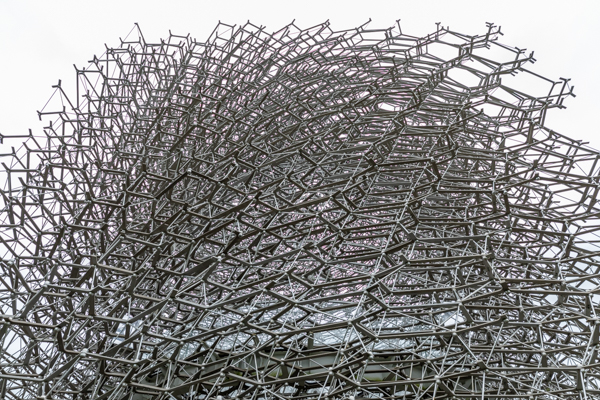 This is The Hive, an art. It’s 17 meters tall and meant to represent life inside a beehive. You’re able to walk under and inside of it. It’s certainly an impressive structure, meant to show the importance of pollinators to our food supply. All that metal? It’s 170,000 aluminum (did you say it like the British in your head? I know you did!) pieces. From a distance it creates a moiré effect, that sometimes happens on your TV when an anchor’s clothes have a small, repeating pattern on them.