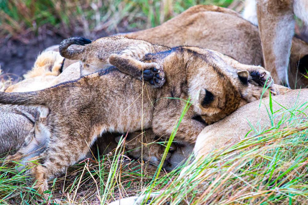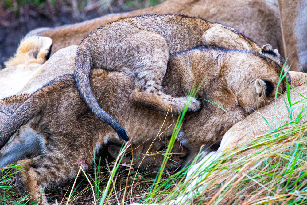 An eleven month-old looks on jealously to the nursing cubs. She is sulking. Mom has weened her, and will lot allow her to suckle at this moment. Gone is the instant, always available food source.