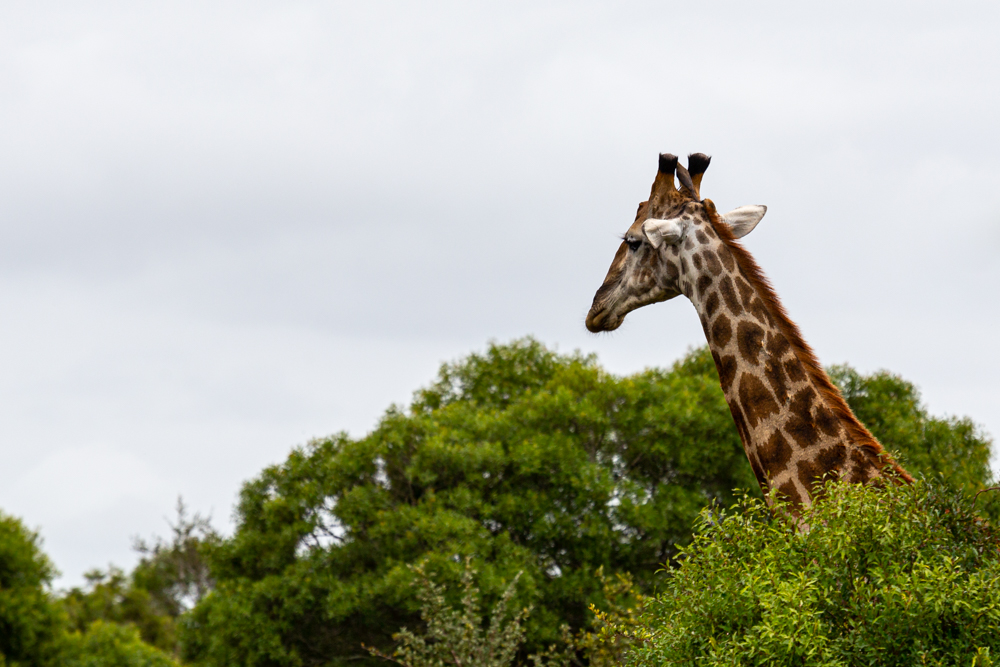 Giraffe enjoy their watchful vantage point. They keep track everything below them, and will move to find you again should you disappear from view. The male giraffe has the larger, thicker horns.
