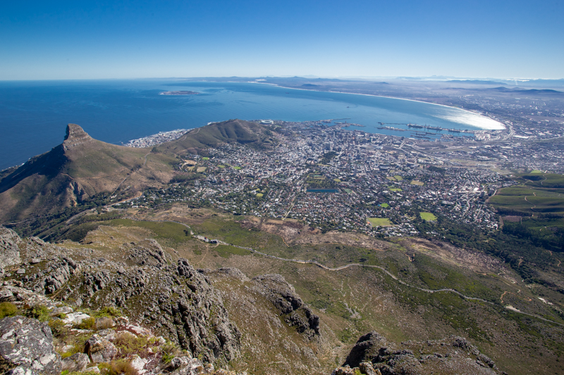 This is from Table Mountain looking down at Camps Bay, the area of town we stayed in. Our hotel is to the left of the field. You can see how the city developed in pockets based on topography. In a later picture, we’ll be on the beach looking back up at this area.