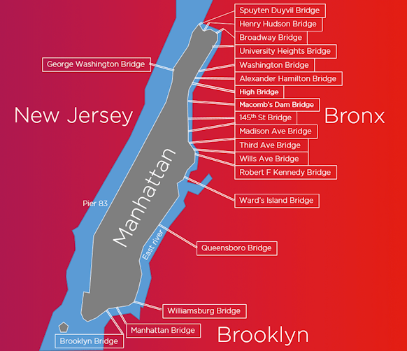 Our journey to the island nation of Hawaii will be a long and perilous one taking place in three stages. First, we must escape Manhattan. This is not easy. Manhattan is designed to keep people from departing. Only 21 bridges connect the island to the rest of the world, along with a few tunnels. That’s roughly 71,000 permanent residents per bridge. Most of these exit routes are heavily fortified with toll plazas and blocked travel lanes, making escape by car slow and expensive. Not everyone makes it.