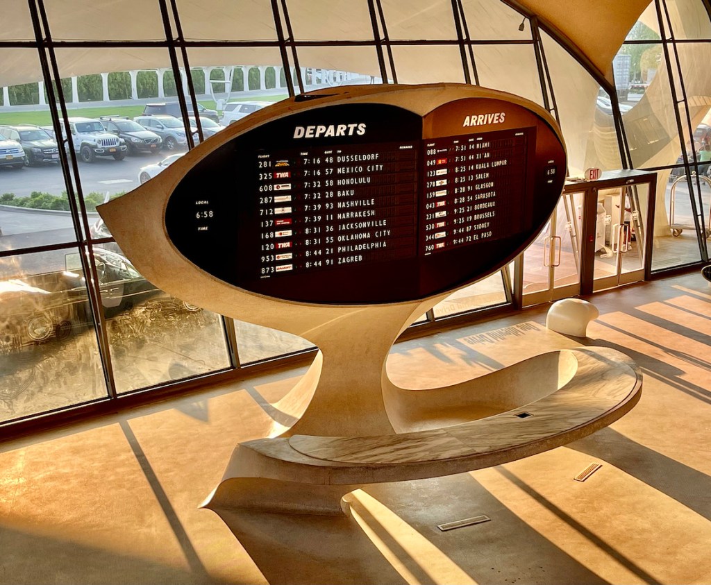 Howard Hughes ran Trans World Airlines and commissioned Finnish-American Architect Eero Saarinen to build him a sophisticated terminal for his sophisticated airline. You’ve seen Saarinen’s work. He built the iconic main terminal at Dulles Airport, with its wing-like roof, The Gateway Arch in St. Louis, and the MIT Chapel in Cambridge. His firm has designed buildings around the world.