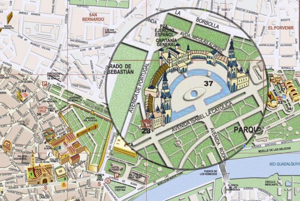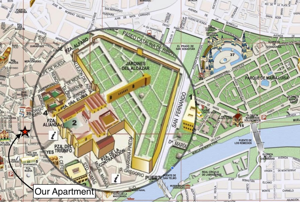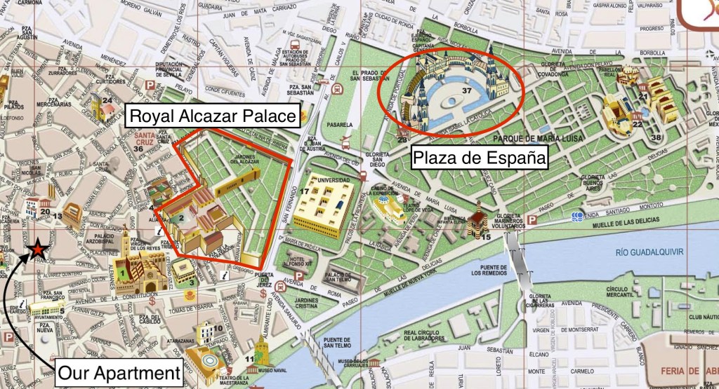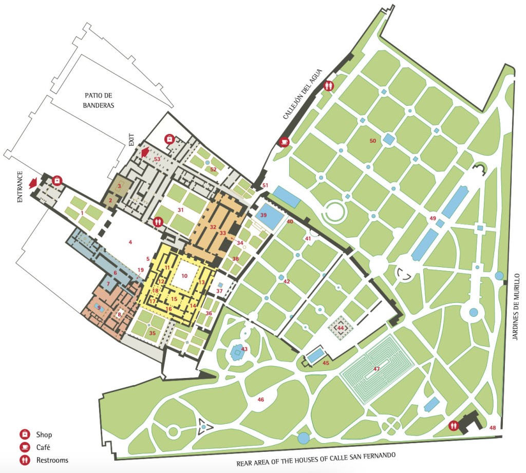 Here is a map of the Alcázar, and you can see it is a variety of buildings from various eras pushed together. The gardens are immense. The royal of family still maintains a residence here.