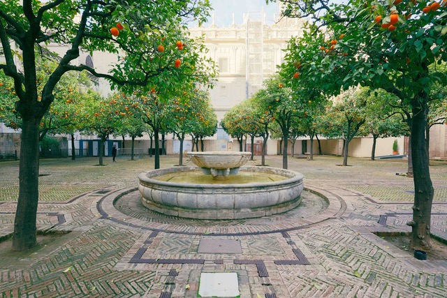 The oranges you see are sour oranges. Nobody eats them directly off the tree. They are everywhere in Sevilla and Granada. Water which feeds the fountains also feeds the trees through channels below the brick. The Muslims valued water as a display of wealth, which makes sense when your baseline is North Africa.