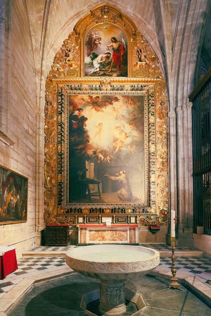 This is the view of the cathedral from the entrance. Tourists enter through a less important side entrance. Like most cathedrals, it is fashioned as a cross with side chapels along the perimeter. Cathedrals seem like a modern day shopping mall, a one stop shop for all your religious needs. The side chapels are the small stores, while the nave and alter the anchor stores, the big reason for coming. Worried about an upcoming trip? Stop by the St. Columbus store, I mean chapel, and make an offering and pray. While here, stop off and confess your sins at the booth. Maybe attend a mid-day mass, too. Or getting Baptized? There’s a store for that.
