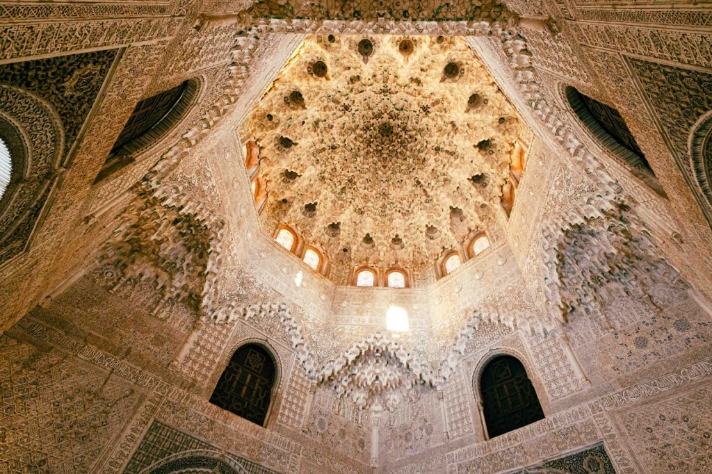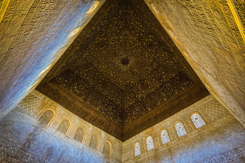 This room functions as a sun dial. The Arabs were generally more attuned to the heavens because their calendar is lunar. It was known, for example, in this area the Heliocentric Model was incorrect. This was not understood in much of Europe till much later. You can see heavy adornment on arches and available surfaces. The ceiling is a geodesic dome, commonly found on mosques. This style is abandoned in the Renaissance, where geometric shapes and simple arches are used. Which then gets abandoned with Baroque. Everything old is new again.