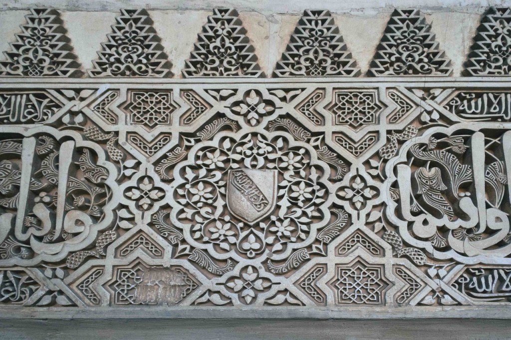 This is the ceiling of the throne room. Only place to photograph without tourists in the shot. The ceiling is a wood carved masterpiece. The detailing on the walls is stunning. I wonder about the artisans who spent their lives doing it. Unfortunately, we know nothing of them. The repeated script is the phrase, “There is no God but Allah, and Muhammad was His messenger,” written over and over again. While the Christians did not favor literacy, the Muslims did only because it allowed followers to read the Koran. The entire place is packed with symbology.