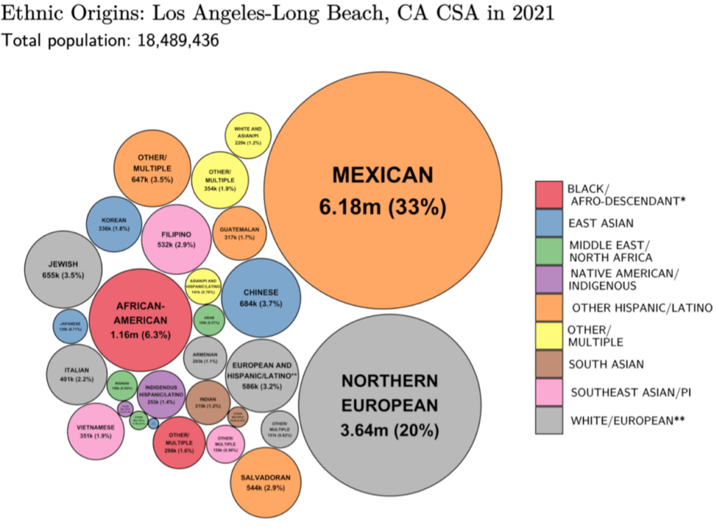 LA is extremely diverse ethnically. About half the population identifies as Latino, many of which are Mexican-Americans. 30% identify as White or having European ancestry, 10% Asian-American, and about 8% African-American. Those are the large groups, which is not to say other groups aren’t present. They most certainly are. Much of LA’s population is foreign born.