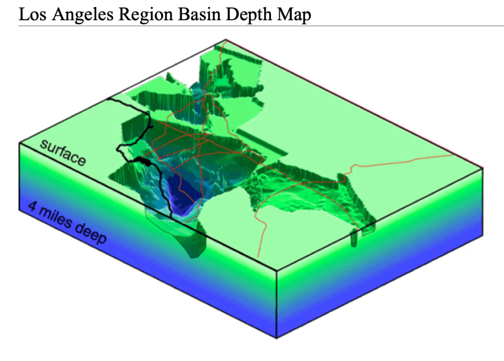 It turns out if you vacuumed up the loose soil, rocks, people, buildings, fossil fuels, and cars from around the LA area, a four mile hole would remain. If you happened to be walking past The Los Angeles Coliseum when all this loose detritus magically vanished, it would take about ninety seconds to free-fall to the bottom. While plunging to your lonely death, there would be plenty of time to admire the vertical cliff faces of the the North American and the Pacific Plate. Let’s take the dive into the rabbit hole of LA’s seismic past and present.