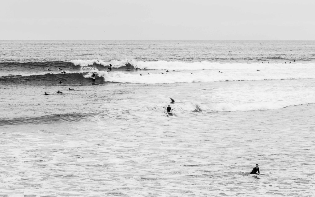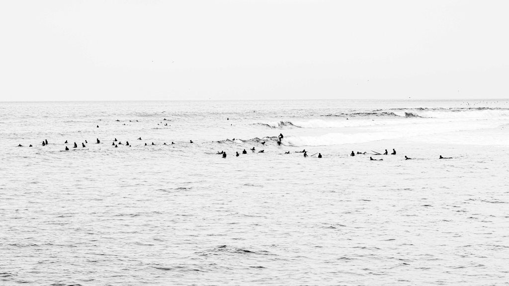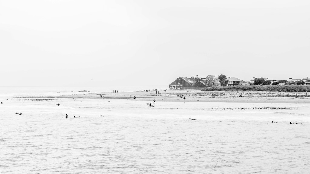 Turn to Malibu, the water is freezing cold but these hardy souls were undaunted. They look like penguins, but in fact are humans waiting to catch a wave. I never got into surfing, as it feels suspiciously like exercise.