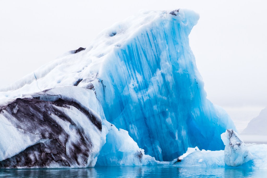 Glaciers tend to terminate in lagoons. The face of the glacier falls into the water layer by layer, in a process called calving. The iceberg slowly melts in the lagoon, which in this case is a chilly mixture of salt and fresh water, before the water molecules are finally returned to the sea. The process, from snow to sweet ocean freedom, can take thousands of years. Glacier means “ice river,” and the process is not unlike rivers in more temperate climates. Rain falls at high elevations and drains its way to the sea. This just takes much, much longer.