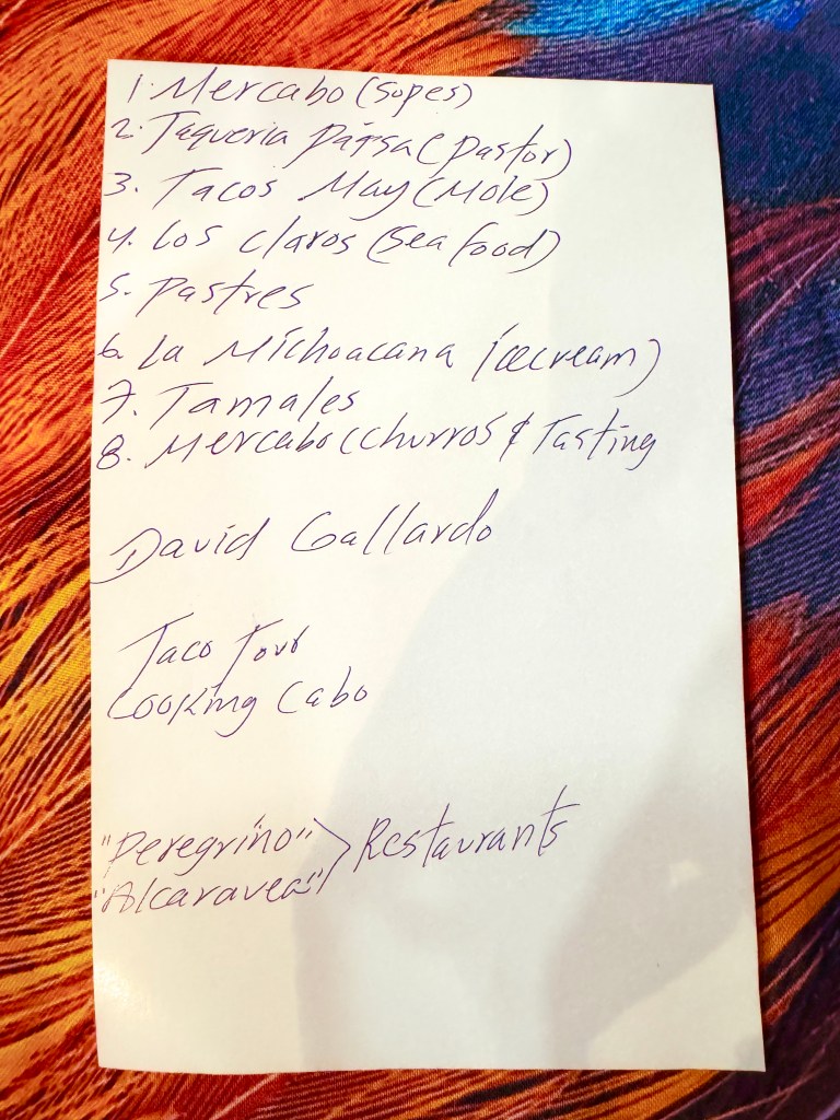 We met our tour guide, David, in downtown Cabo near the marina. The tour was advertised as all you can eat and drink with several stops, returning to base for tequila and churros. None of us were prepared for the volume of food that followed.