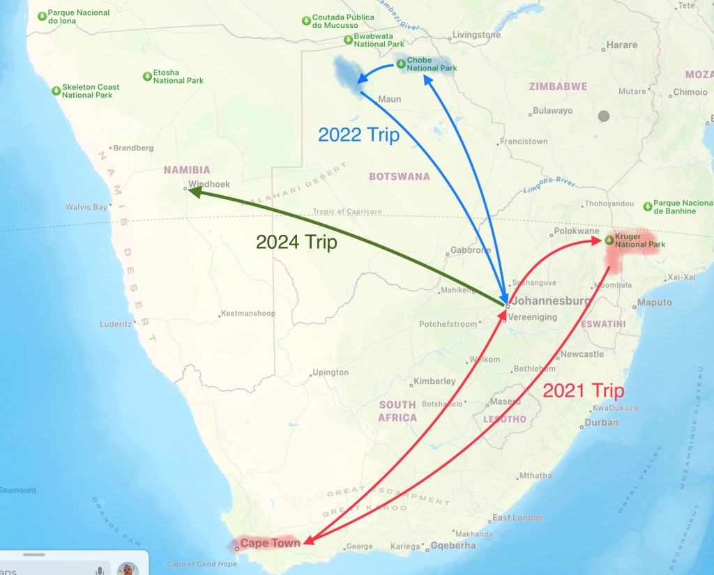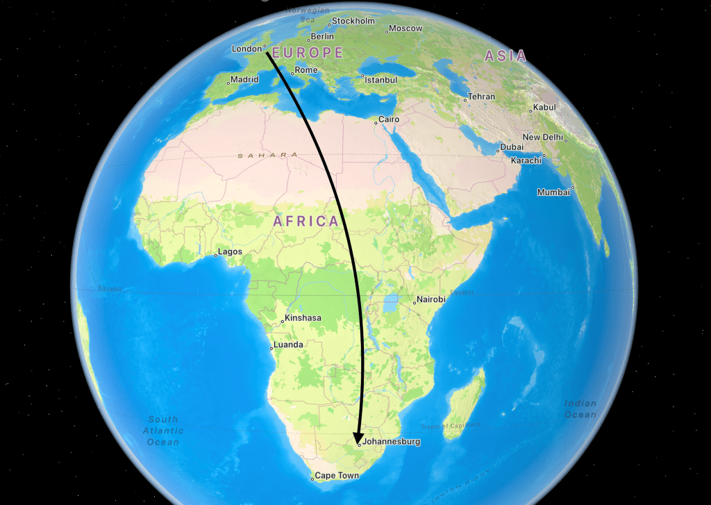 We begin this sojourn crossing The North Atlantic, transferring in London, and then flying due south to Johannesburg, South Africa. We sleep while flying over Africa, and land tomorrow morning. If the Gods of Travel smile upon us, we are expecting 20 hours of travel.