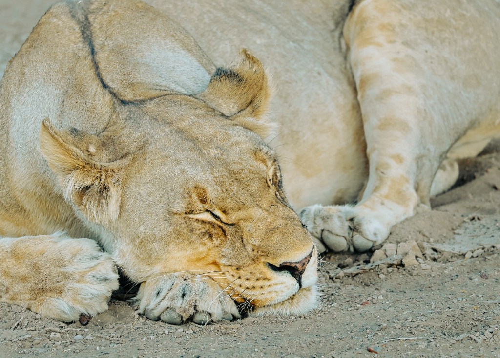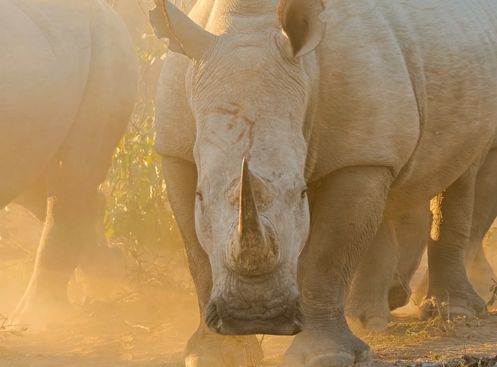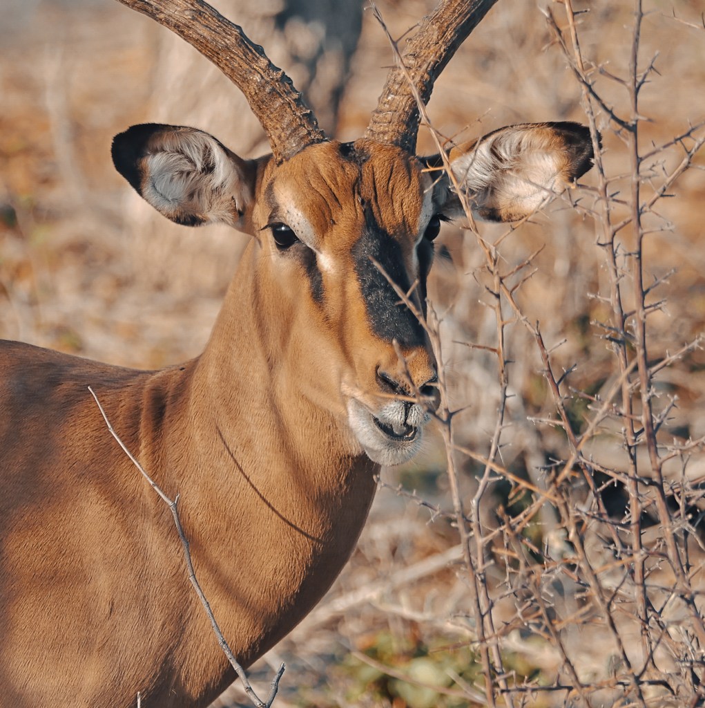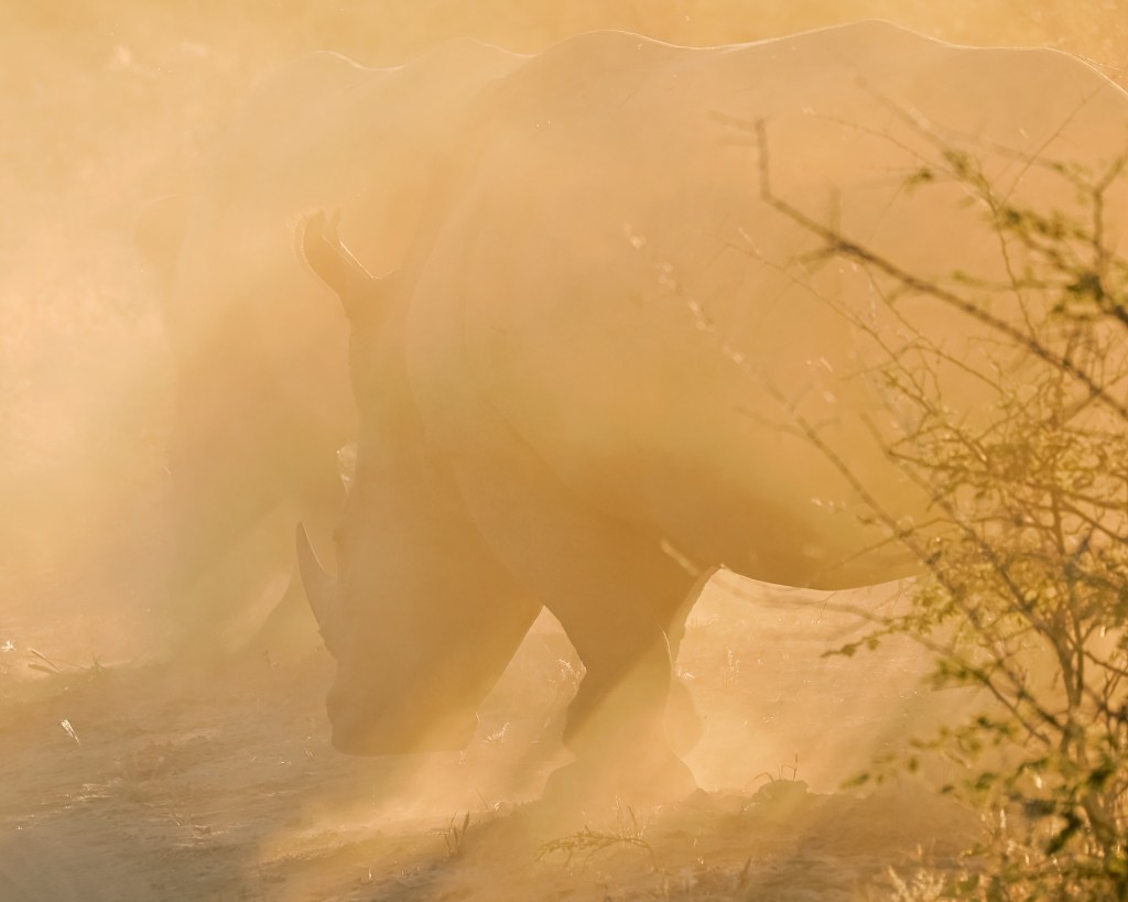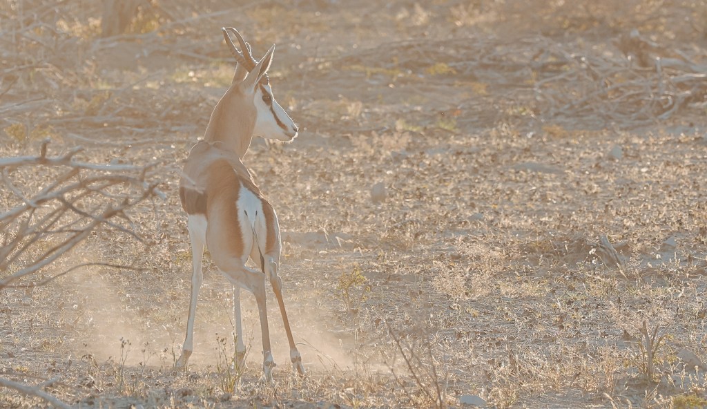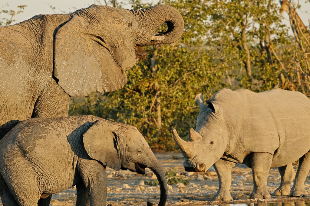 This is a young male lion, just starting a pride with his brother and one female. This is the female, still sleeping and reluctant to wake up.The male giraffe is interested, but it’s not clear if the female’s buying.We came across a group of white rhinos moving towards the local watering hole. White rhinos tolerate humans pretty well, and while suspicious of us are not overtly alarmed by our presence.A group of rhinos is called a crash, and it gets dusty when they move around.This white rhino is annoyed these elephants are near. It eventually pushes them off, but the mother elephant says what’s on her mind before goingThis is a Sprinbok. They are quite tasty. A male Black-faced Impala looks at the stupid humans skeptically.