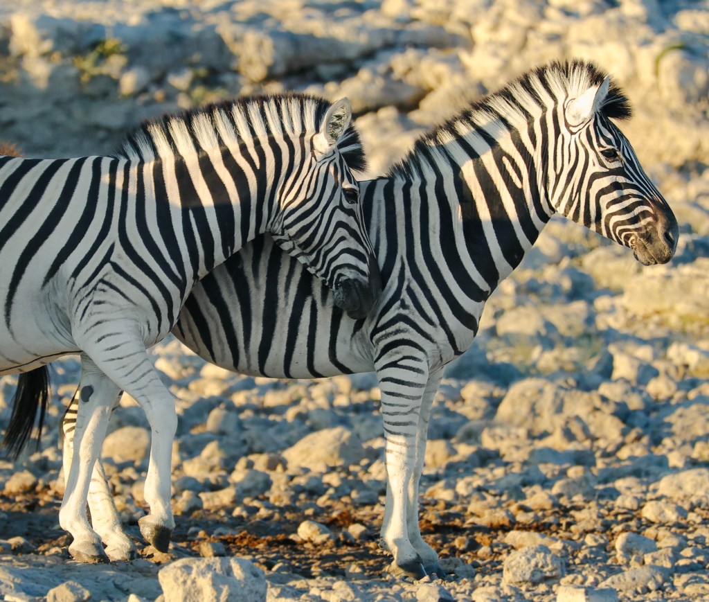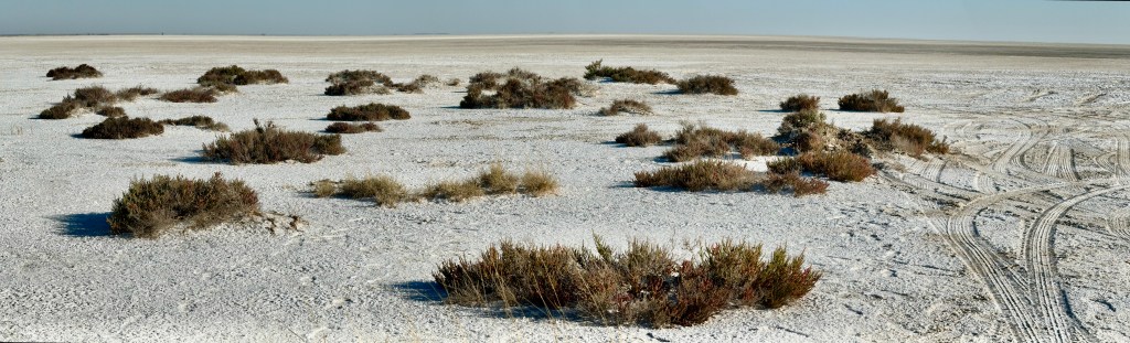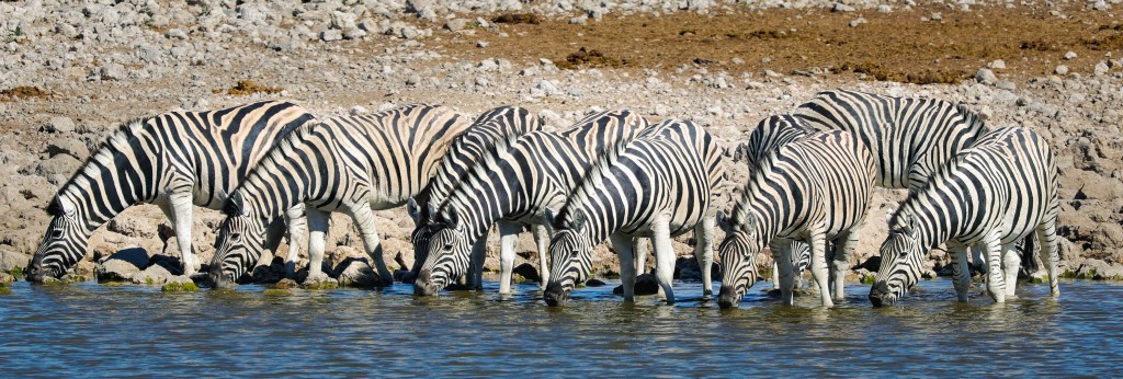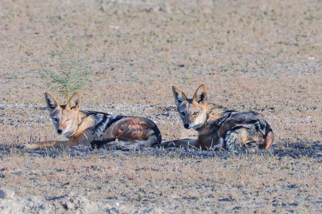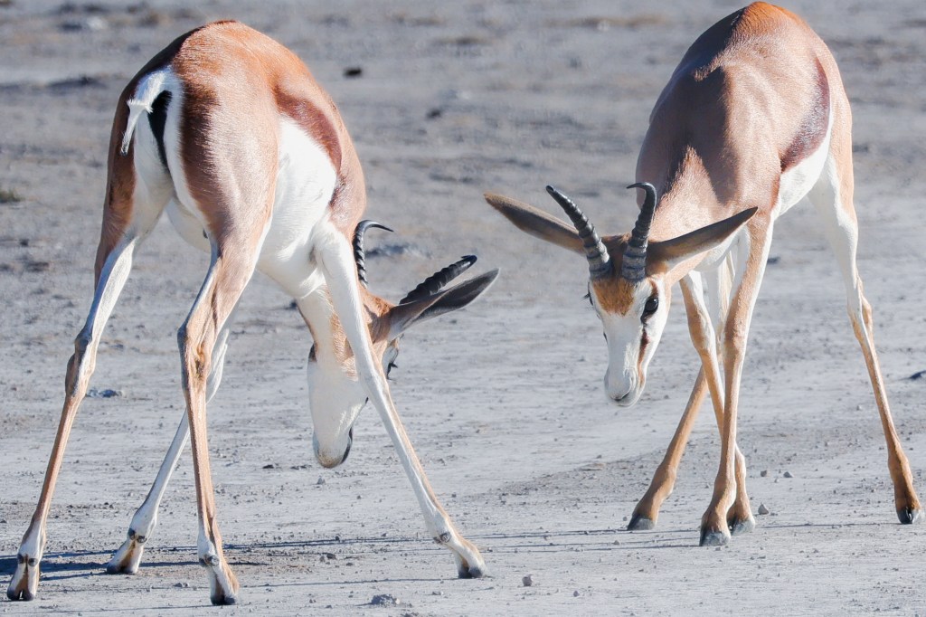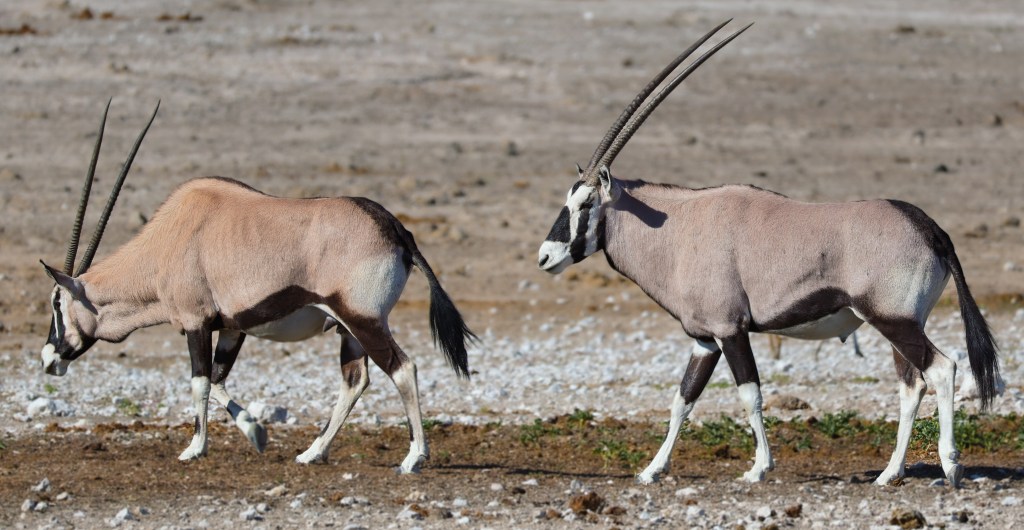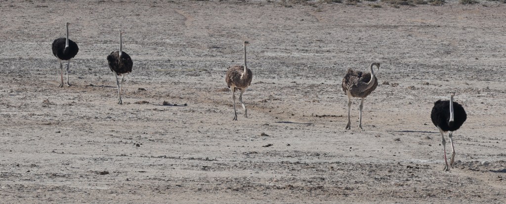 Zebra nuzzle each other at dawn. It was neat to see Zebra so relaxed. They are skittish and will flee at the slightest noise. You have to be slow and patient for these animals.A wildebeest, common game species in Southern AfricaTwo jackals eye us suspiciously. They are scavengers, and while they look like some dog species, they would not make good pets.Two young male springbok are practicing rutting. This is how males establish dominance and “win” the right to mate with a group of females. These play fights are never serious, but adult males can kill each other. Mating season is coming. A female springbok.Relaxed zebras, taking a break in the hot sun.The oryx right is chasing the oryx on the left. He does not like another male getting too close to his harem. The interloper is teasing the established male, un-seriously charging him and running around him.Even a Jackal’s gotta drink.I know what you’re thinking and, yes, they are tasty.A herd of ostrich also comes to drink. They are the largest living birds on the planet.To drink, they scoop water into their mouths and then raise their necks so the water falls down the throat. It seems like a lot of work.Groups tend to dominate the watering hole for a period of time, then once they’ve had their fill, relinquish it for another species or group to assume dominance. Thus, once zebras are done elephants take over. Once elephants have drunk, a crush of rhinos make an appearance, and so on. This can go on for hours and is fascinating to watch.Our guide arranged for us to have breakfast near the salt pan, which is 4800 square kilometers and visible from space. It is the ruminants of a large lake. During heavy rains the area floods and flamingos come, which must be quite a sight. Otherwise, it is a lonely, lifeless place. Humans. Dangerous, do not approach except in rare circumstances. It helps to be trained when doing so.