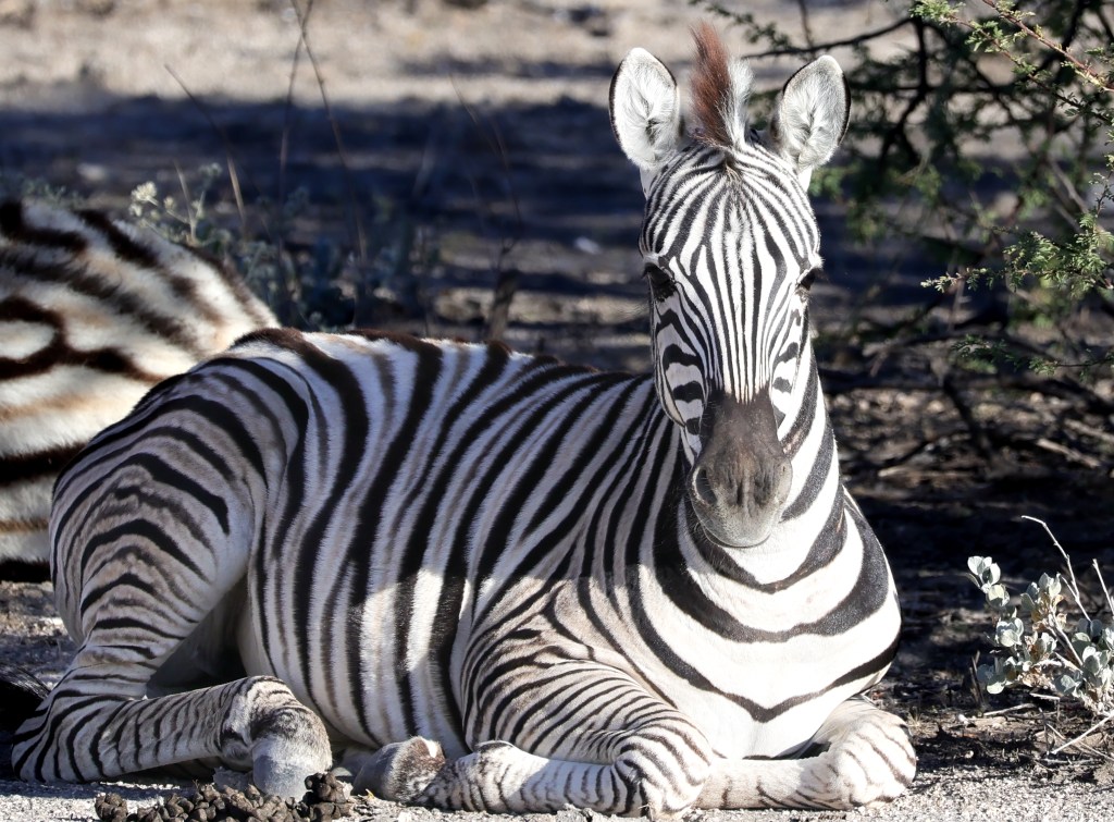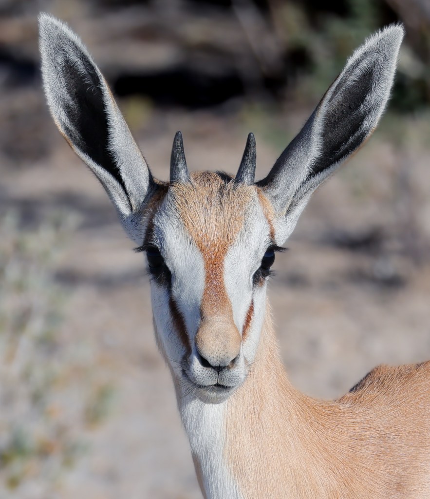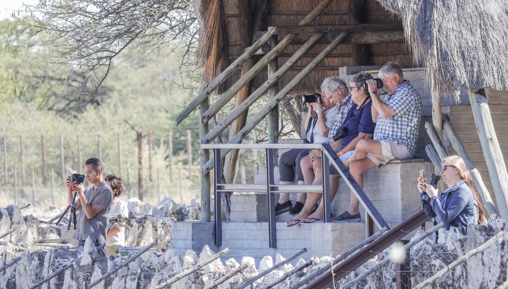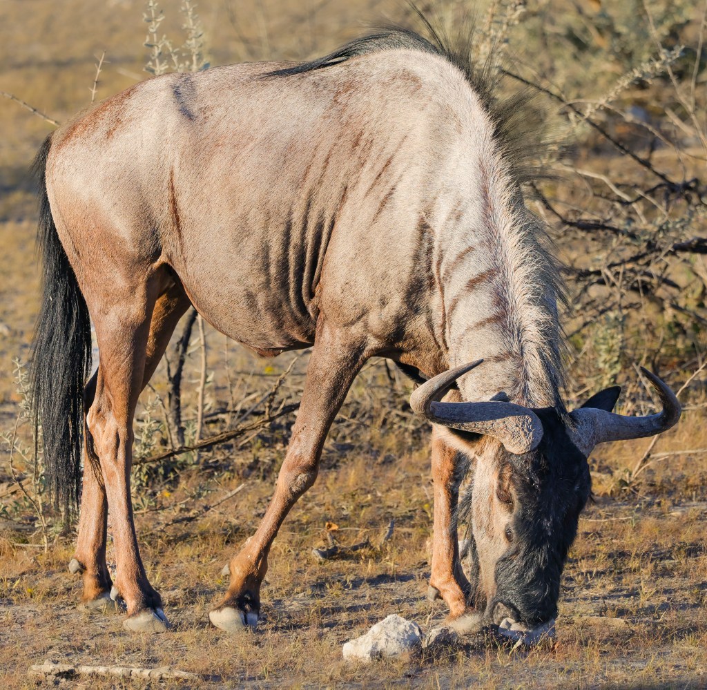 Zebra nuzzle each other at dawn. It was neat to see Zebra so relaxed. They are skittish and will flee at the slightest noise. You have to be slow and patient for these animals.A wildebeest, common game species in Southern AfricaTwo jackals eye us suspiciously. They are scavengers, and while they look like some dog species, they would not make good pets.Two young male springbok are practicing rutting. This is how males establish dominance and “win” the right to mate with a group of females. These play fights are never serious, but adult males can kill each other. Mating season is coming. A female springbok.Relaxed zebras, taking a break in the hot sun.The oryx right is chasing the oryx on the left. He does not like another male getting too close to his harem. The interloper is teasing the established male, un-seriously charging him and running around him.Even a Jackal’s gotta drink.I know what you’re thinking and, yes, they are tasty.A herd of ostrich also comes to drink. They are the largest living birds on the planet.To drink, they scoop water into their mouths and then raise their necks so the water falls down the throat. It seems like a lot of work.Groups tend to dominate the watering hole for a period of time, then once they’ve had their fill, relinquish it for another species or group to assume dominance. Thus, once zebras are done elephants take over. Once elephants have drunk, a crush of rhinos make an appearance, and so on. This can go on for hours and is fascinating to watch.Our guide arranged for us to have breakfast near the salt pan, which is 4800 square kilometers and visible from space. It is the ruminants of a large lake. During heavy rains the area floods and flamingos come, which must be quite a sight. Otherwise, it is a lonely, lifeless place. Humans. Dangerous, do not approach except in rare circumstances. It helps to be trained when doing so.