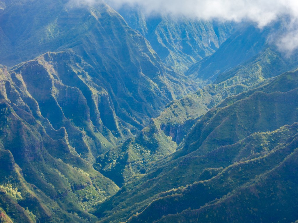 Water falls from the mountain tops continuously for the same reason Milford Sound and Doubtful Sound (not an actual sound) are so wet. Warm air filled with moisture is pushed upwards by the slopes, where it cools and condenses. Cold air cannot hold as much water. The water then falls back to Earth, cascading down cliff sides and collecting into streams as it returns to the sea. This is a powerful process, and eventually it will erode away Kauai as it has already done to the numerous atolls of the Hawaiian chain that are not habitable. In a “brief” 5 million years, much of this place will be gone.